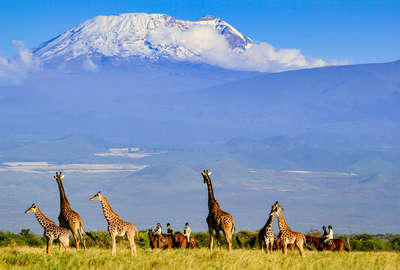 Riders and giraffe on a horseback safari